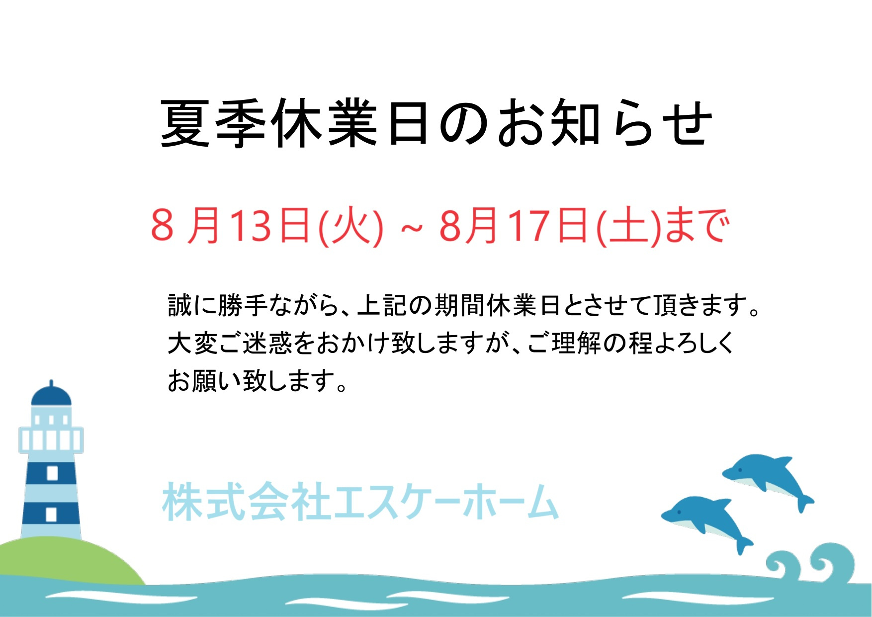夏期休業のお知らせ|鹿沼市の賃貸・管理・売買の不動産のことなら株式会社エスケーホーム